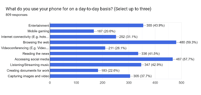Another important part of the OS question is usage, and respondents also indicated what they spent the majority of their time doing on their smartphones other than communicating and were told to select up to three activities.